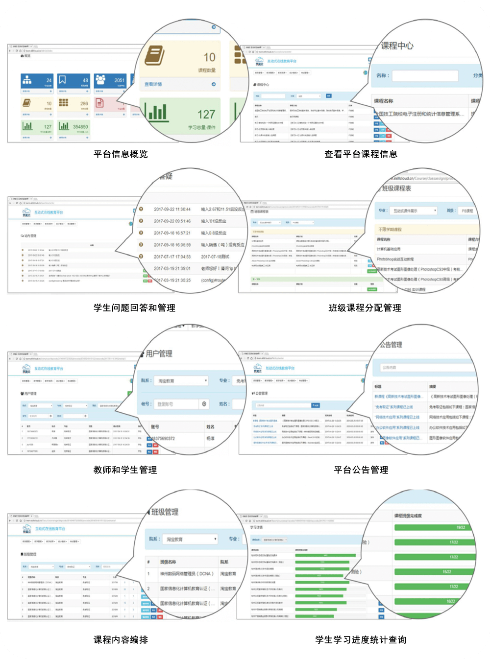 包括教务管理、教学管理、在线培训、资源课程管理、站内答疑、新闻公告、作业管理、统计分析等模块 |